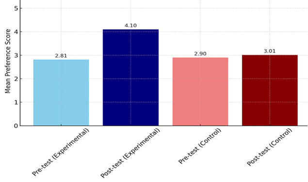 To further validate these results, an independent samples t-test was conducted to compare the post-test scores between the experimental and control groups. The analysis yielded a t-statistic of 20.23 and a p value less than 0.001, indicating a statistically significant difference between the two groups. This provides strong evidence that the intervention was effective in improving students’ preferences for traditional foods (Figure 1).