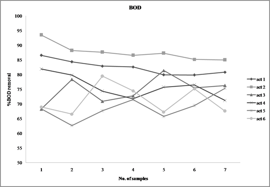 Biological Oxygen Demand (BOD): Figure 4 shows the trend line of percentage removal of BOD for the no. of sampling for different sets. The soil enables various microorganisms to grow in it and so it is the main carrier of the microorganisms in the system. The removal efficiency of BOD for set 1: 82.44%, for set 2: 87.63%, for set 3: 74.78%, for set 4: 7:5.88%, for set 5 68.67 and for set 6: 71.35%. The BOD removal efficiency for set 2 was highest and was 87.963%. For set 2, the average inlet BOD value observed was 203.35mg/l and the average outlet BOD value observed was 24.62mg/l. It was observed that as the flow rate increased the removal efficiency of the BOD decreased. Provided the intermittent aeration, the efficiency was increased as aeration condition enabled the decomposition of microorganisms at a higher rate.